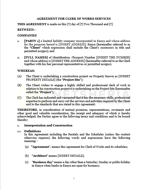 An Agreement for Clerk of Works is a formal document that outlines the terms and conditions under which a Clerk of Works will be engaged by a client. This legal agreement specifies the duties and responsibilities of the Clerk of Works, who acts as the client’s representative on the construction site, ensuring that the quality of materials and workmanship meets the project’s standards and specifications. The Clerk of Works is responsible for regular site inspections, verifying that construction aligns with the design plans, and maintaining high-quality standards throughout the building process.
