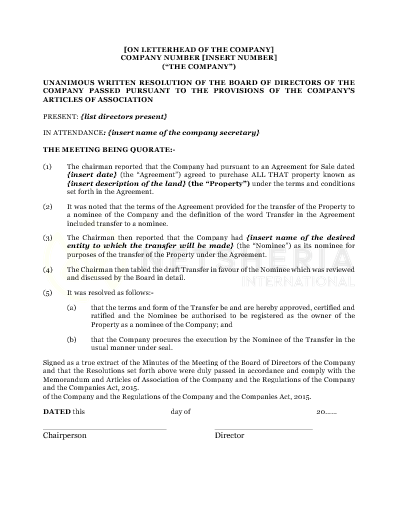A board resolution for the appointment of a nominee pursuant to a sale transaction is a formal document that records the decision of a company’s board of directors to appoint a specific individual or entity to act on behalf of the company in relation to a particular sale. This resolution is typically required when a company is selling a significant asset or a portion of its business and needs to designate a nominee to handle various aspects of the transaction.