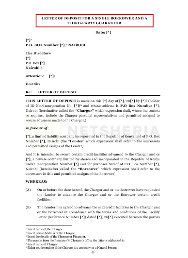 This is a letter of deposit also Known as an Informal Charge executed between the Borrower of a loan, the Chargor who is the third-party guarantor and the Lender. It is done in favour of the Lender and acts as security for a sum/credit/loan advanced to the Borrower. It defines the terms under which such loan has been granted and provides mechanisms of debt collection and or remedies to the Lender upon default of the Borrower.